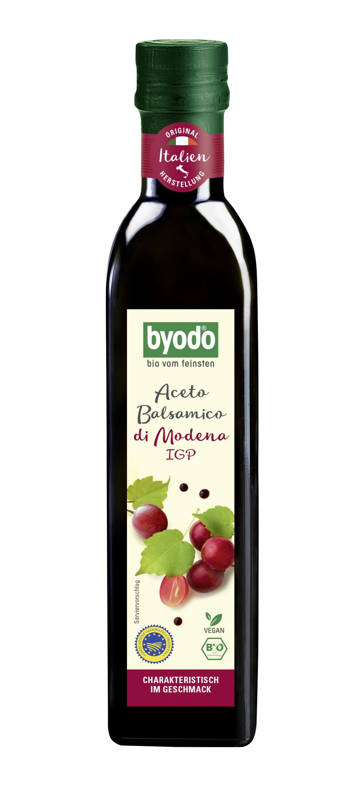 Der Aceto Balsamico di Modena IGP (6% Säure) von Byodo stammt aus dem Herzen der nord-italienischen Essigproduktion - Modena & der Reggio Emilia. Der tief-dunkle Balsamessig ist durch sein spezielles Byodo Mischungsverhältnis von feinem Bio-Rotweinessig und konzentriertem Traubenmost besonders ausgewogen und harmonisch im Geschmack. Ein herrlich vollmundiger, temperamentvoller Genuss!