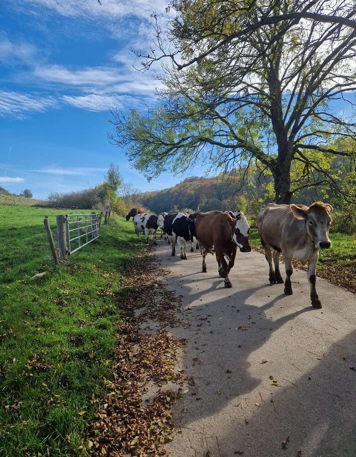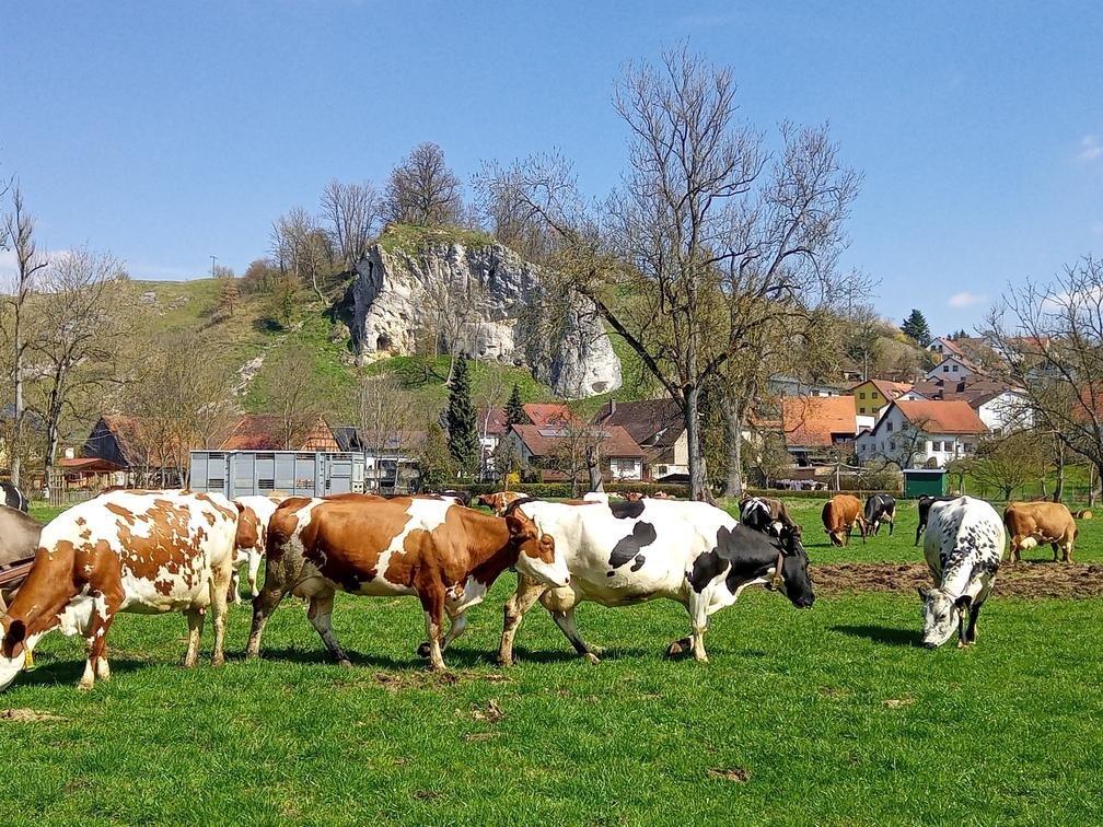 Unsere Milchkühe weiden vom Frühjahr bis zum Herbst auf den frischen Wiesen im Naturschutzgebiet Eselsburger Tal und fressen das frische Gras. Davon profitiert die Gesundheit und Milchqualität der Kühe, das macht die Milch für wertvoll und nährstoffreich.