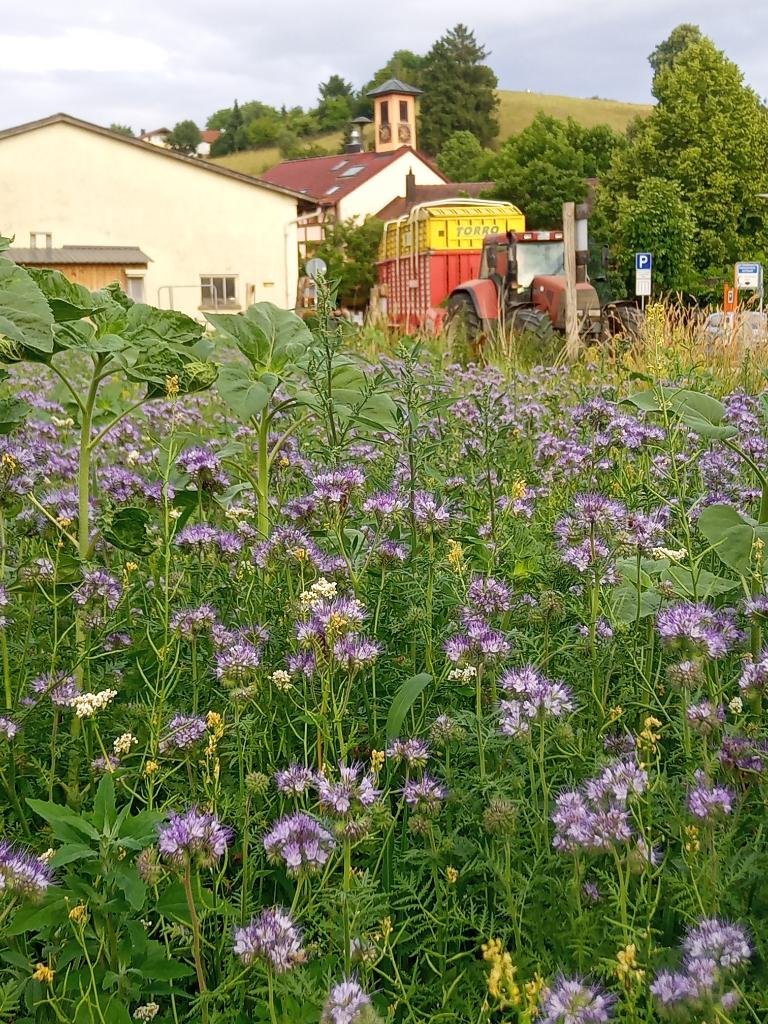 Wir lassen es auf unserem Gemüseacker, neben unseren Getreideäckern, auf abgetrennten Streifen an den Weiden, aber auch auf unserem Hof blühen. Auf diese Weise bemühen wir uns Lebensräume und Nahrungsangebote für viele Insekten zu bieten.