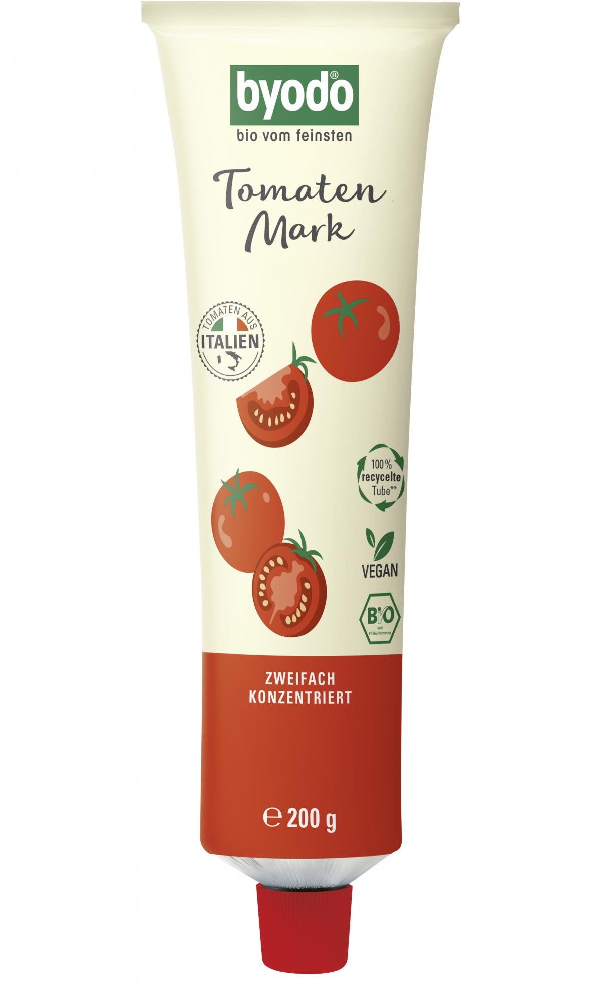 Doppelte Konzentration für ein vielfaches an Genuss. Das verspricht das Byodo Tomatenmark Doppelfrucht in der praktischen und zu 100% recycelten Tube. Der intensive Geschmack sonnenverliebter, italienischer Tomaten wurde in dem leckeren Bio-Tomatenmark herrlich eingefangen und gibt vielen Speisen eine wunderbar fruchtige Note.